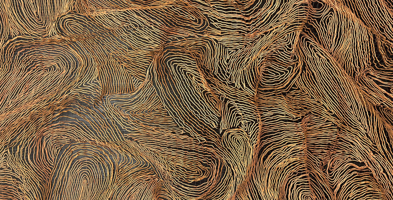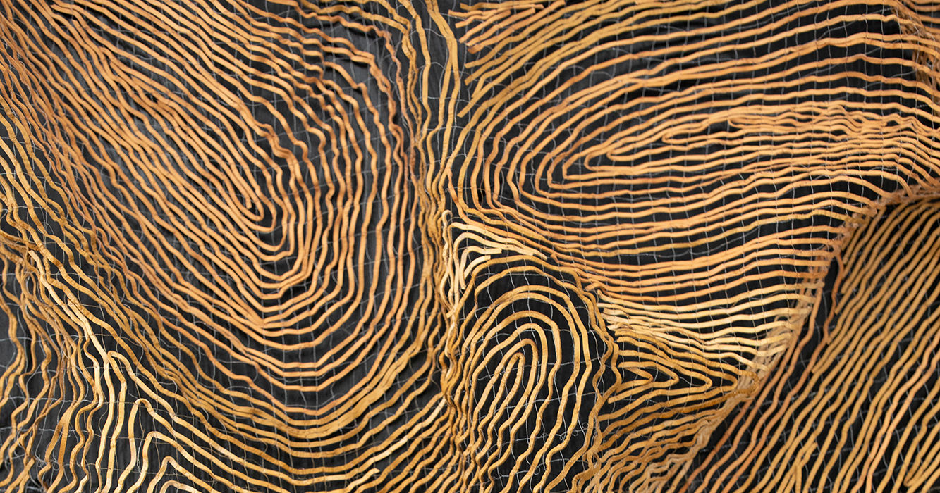 Flux is an immersive textile that weaves together elements of magic and chaos. It defies traditional weaving techniques with leather lace and nylon string to create three-dimensional landscapes that seem to float in mid-air. The translucent layers invite viewers to see through the piece, discovering new perspectives and shadows as they move around it.