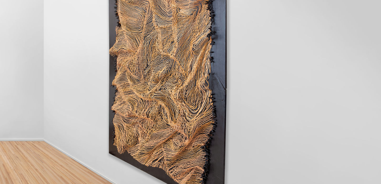 Made from leather lace, nylon string, hand dyed beads and Shou Sugi Ban wood, the ancient Japanese wood-preserving technique dating back to the 18th century. Flux is a testament to the beauty of embracing the mess and losing control, creating something structural and alive from delicate materials.