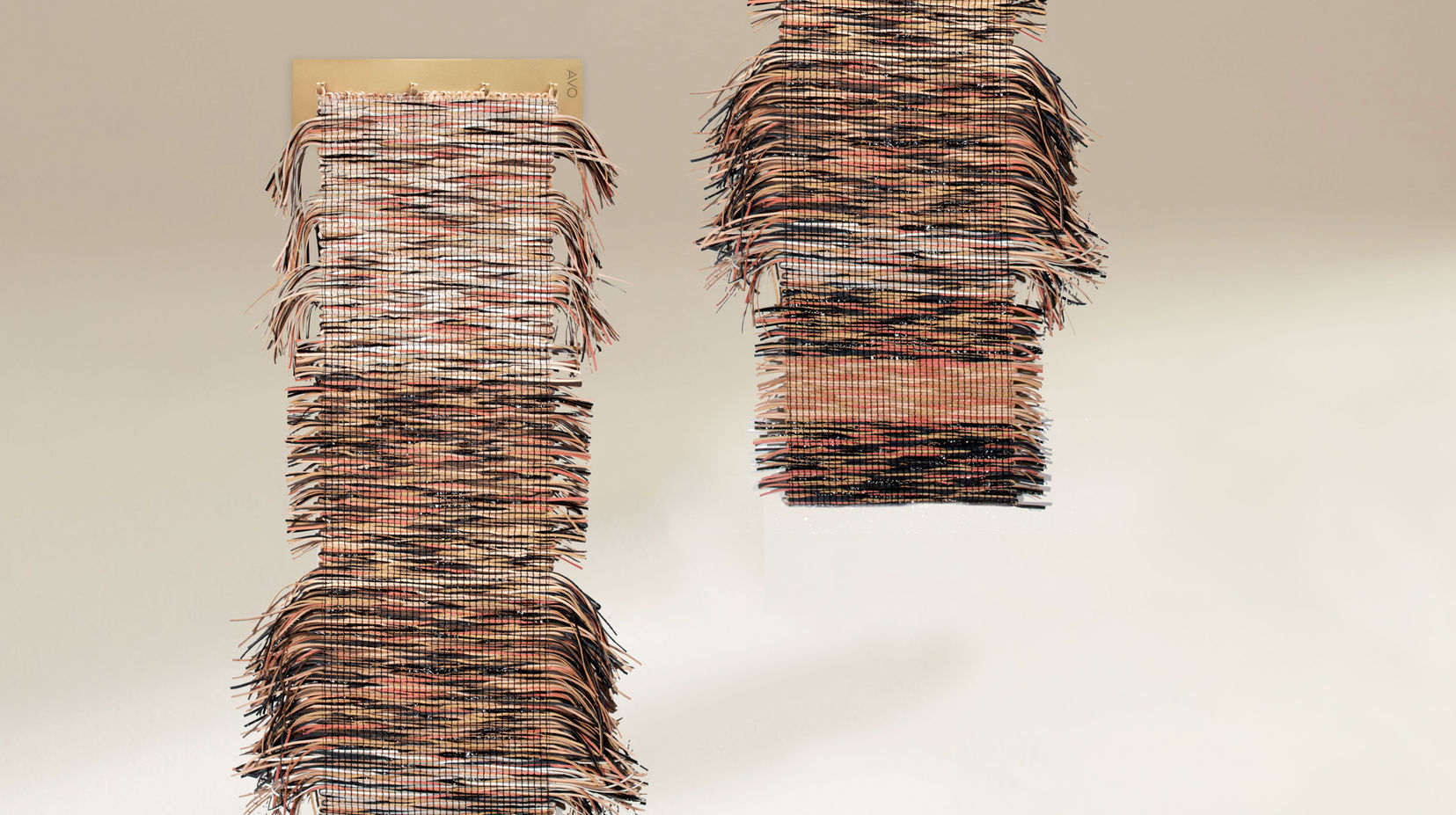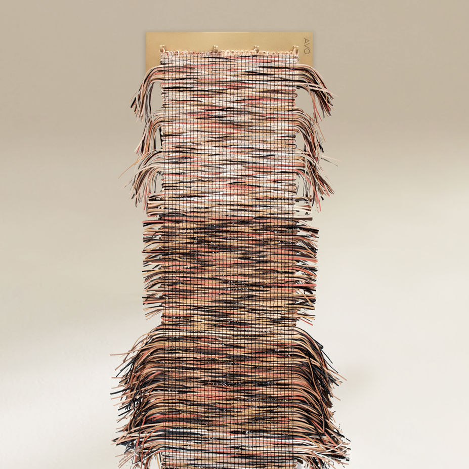 Cascade celebrates the beauty of woven cloth and the rhythmic process behind it. This piece is made to look like its moving, flowing with the twists of leather and fringe bursting out from the selvage edge. The earth tones evoke the ground vibrating and shifting below you.