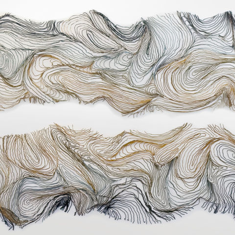 Flux is an immersive textile that weaves together elements of magic and chaos. It defies traditional weaving techniques with leather lace and nylon string to create three-dimensional landscapes that seem to float in mid-air. The translucent layers invite viewers to see through the piece, discovering new perspectives and shadows as they move around it.